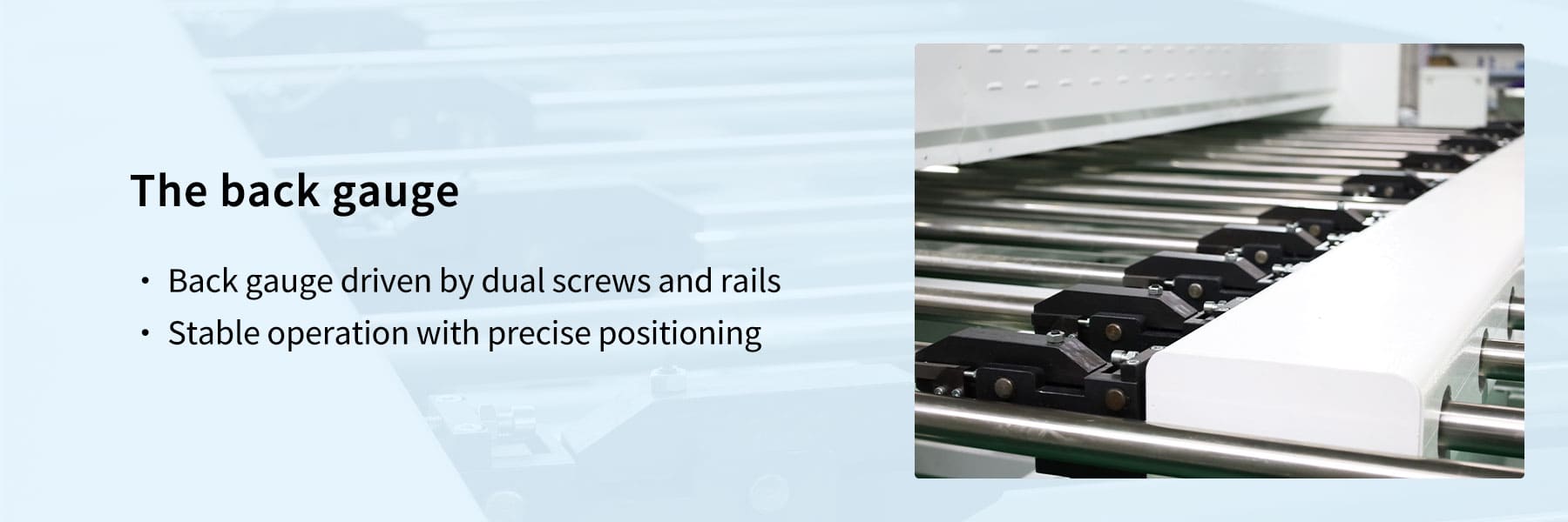 Zadní měřidlo vertikálního drážkovacího stroje V je poháněno duálními šrouby a kolejnicemi, poskytuje stabilní provoz a přesné polohování, což zajišťuje konzistentní řezné vzdálenosti pro každý průchod, čímž se zlepšuje přesnost a účinnost obrábění.