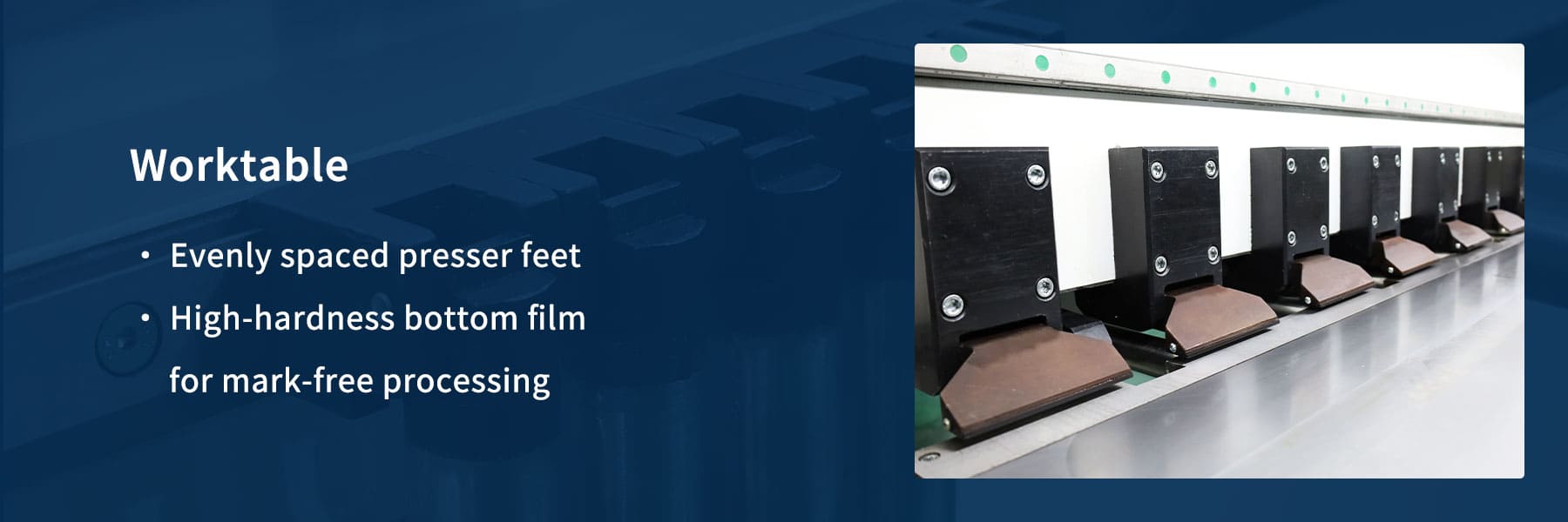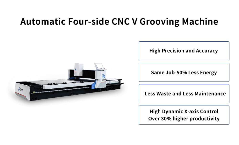 Stroj CNC V Groove má otevřený pracovní stůl, s oboustranným lisovacím nohám pro pevnou fixaci a film s vysokou tvrdou spodní částí pro zpracování bez značky.